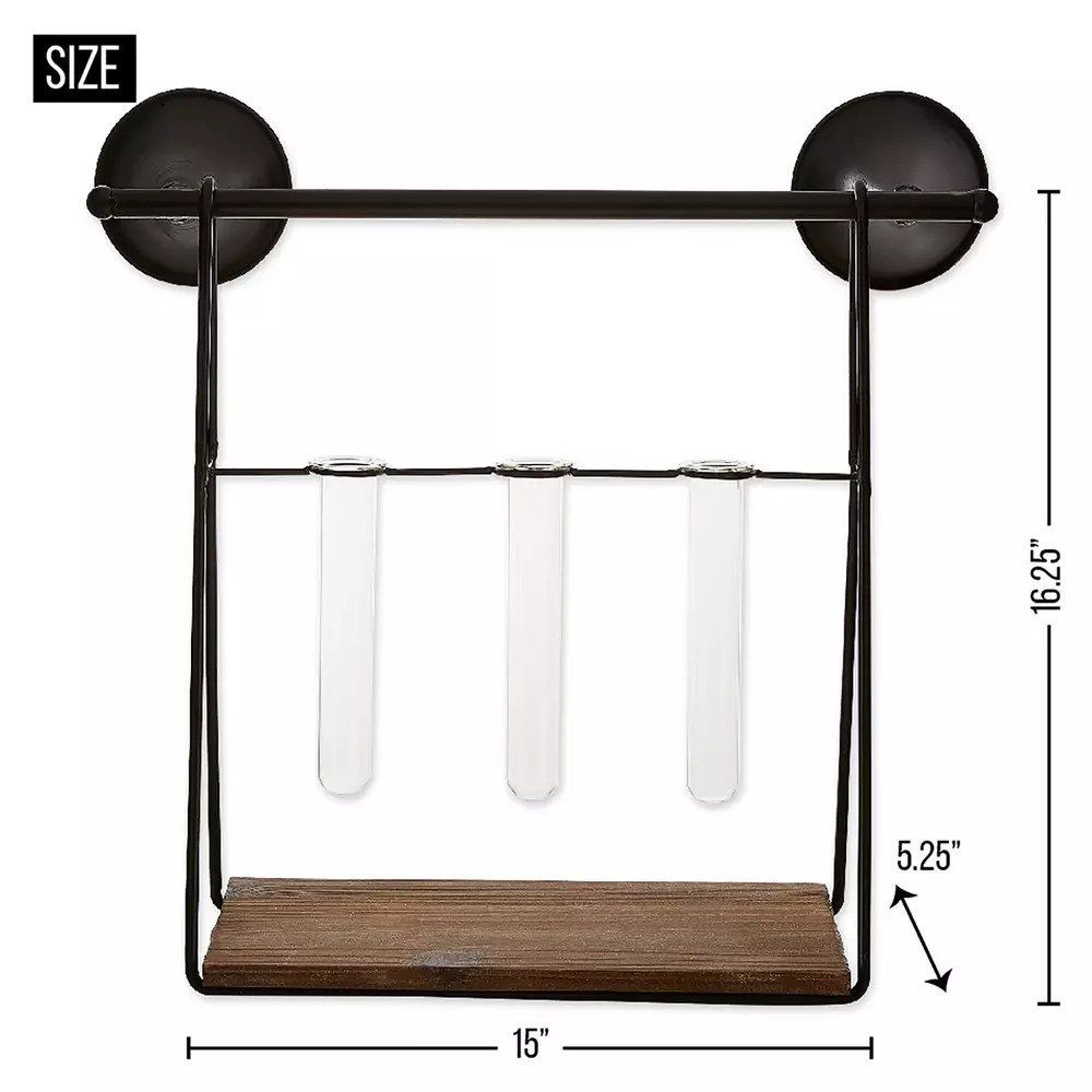 • Featuring a black iron frame with a wooden shelf and 3 small vases, this is the perfect plant propagation paraphernalia! Fill with the plants or décor of your choice to create a stunning wall mounted piece.