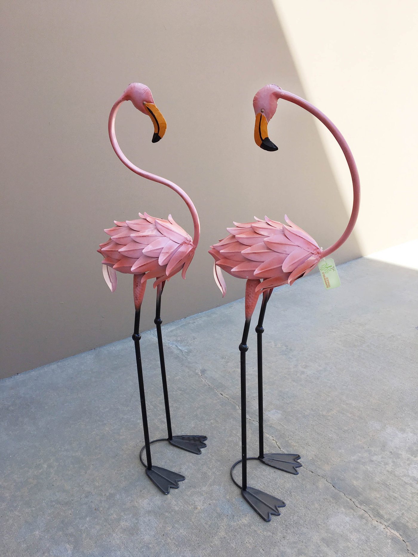 • Brighten your favorite space with a luscious touch of the tropics. These life-sized metal flamingo sculptures make a colorful splash that's a pure delight.