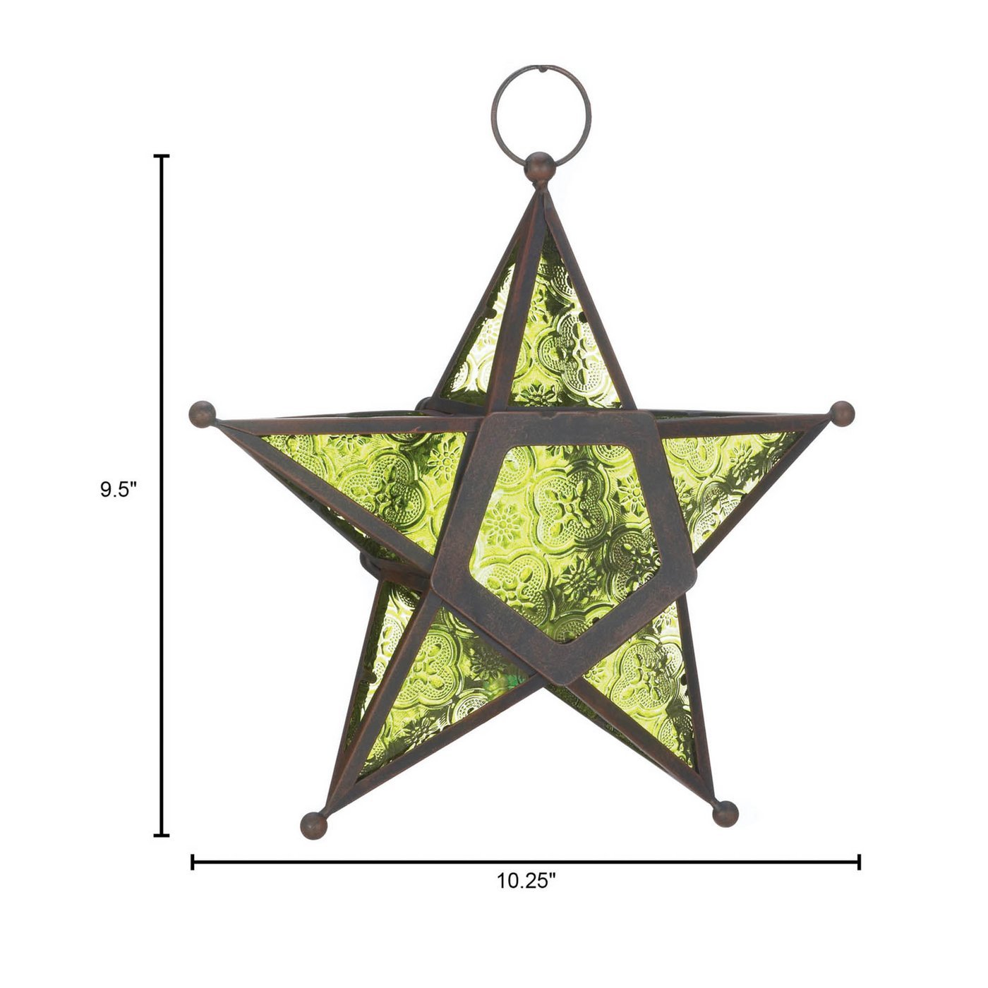 • Add a candle to this five-pointed star to fill the night with celestial light! Artistic hanging lantern features ornate panels of emerald green set into a wrought-iron frame.