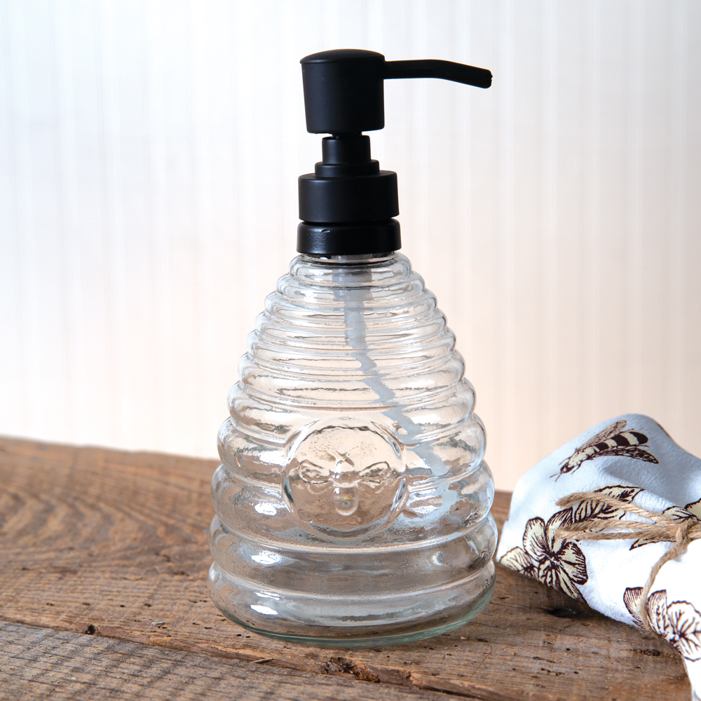 Have your guests buzzing about your bathroom or kitchen! This pumper features durable glass shaped in a beehive with a bee in its center. Pumper is finished in matte black. Dispenser holds 18 ounces of liquid.