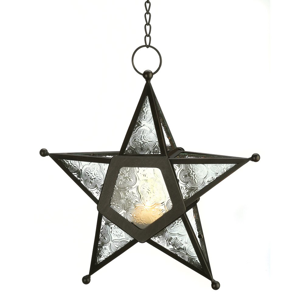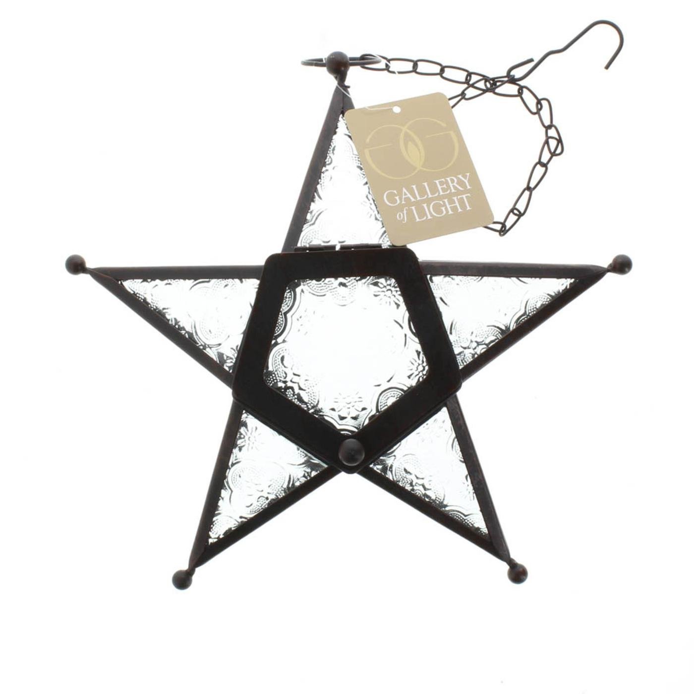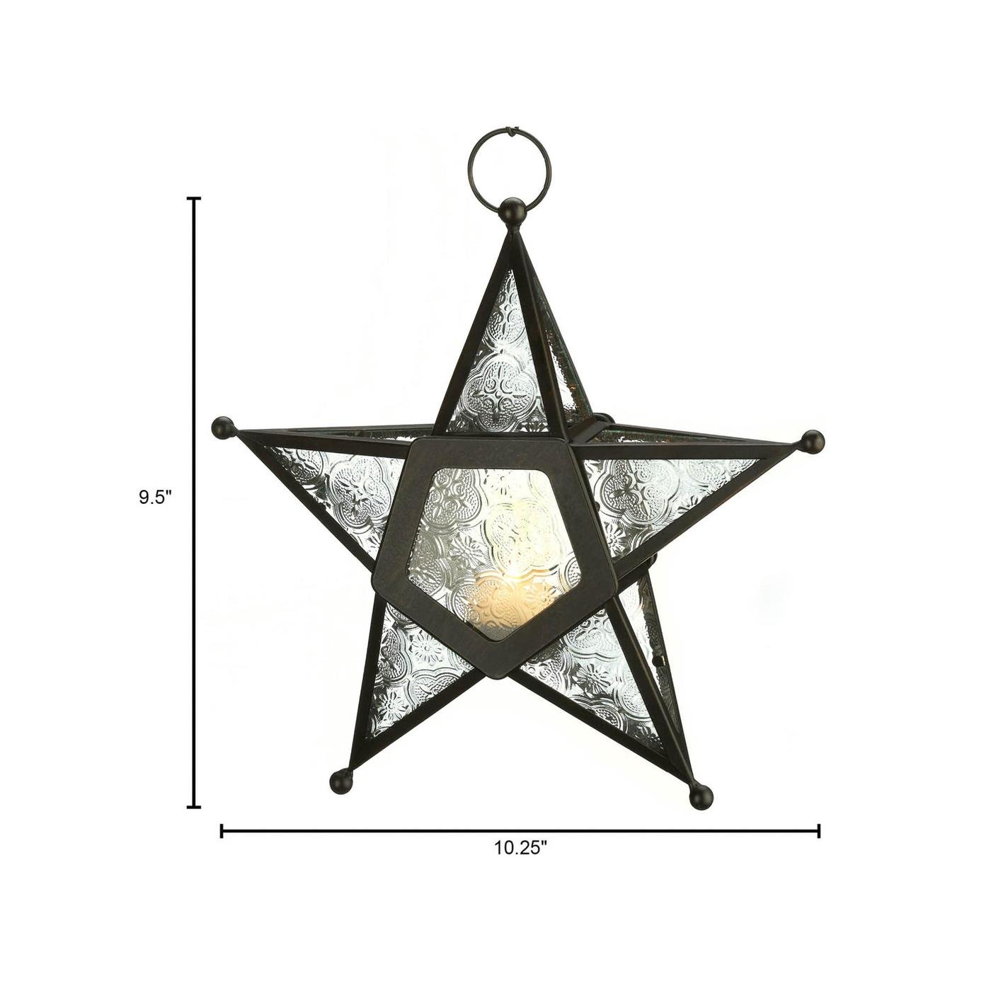 • Add a candle to this five-pointed star to fill the night with celestial light! Artistic hanging lantern features ornate panels of clearest glass set into a wrought-iron frame.